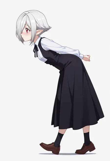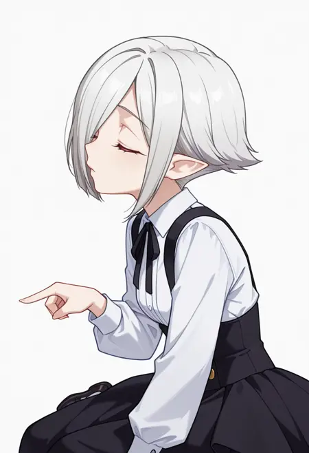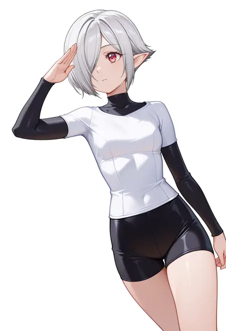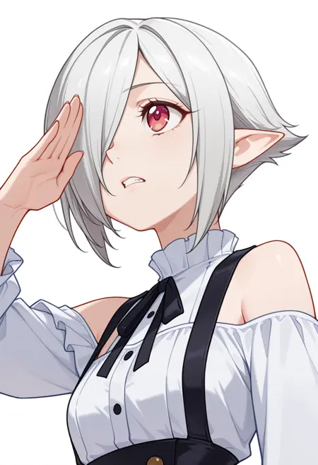 persephoneII_cnr, 1girl, grey hair, short hair, hair over one eye, pointy ears, red eyes,
