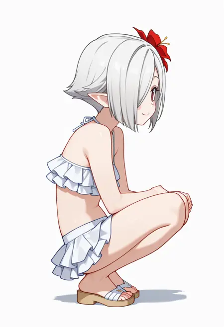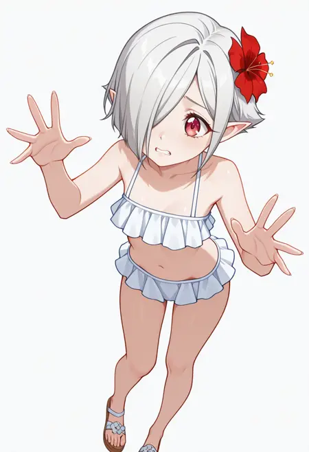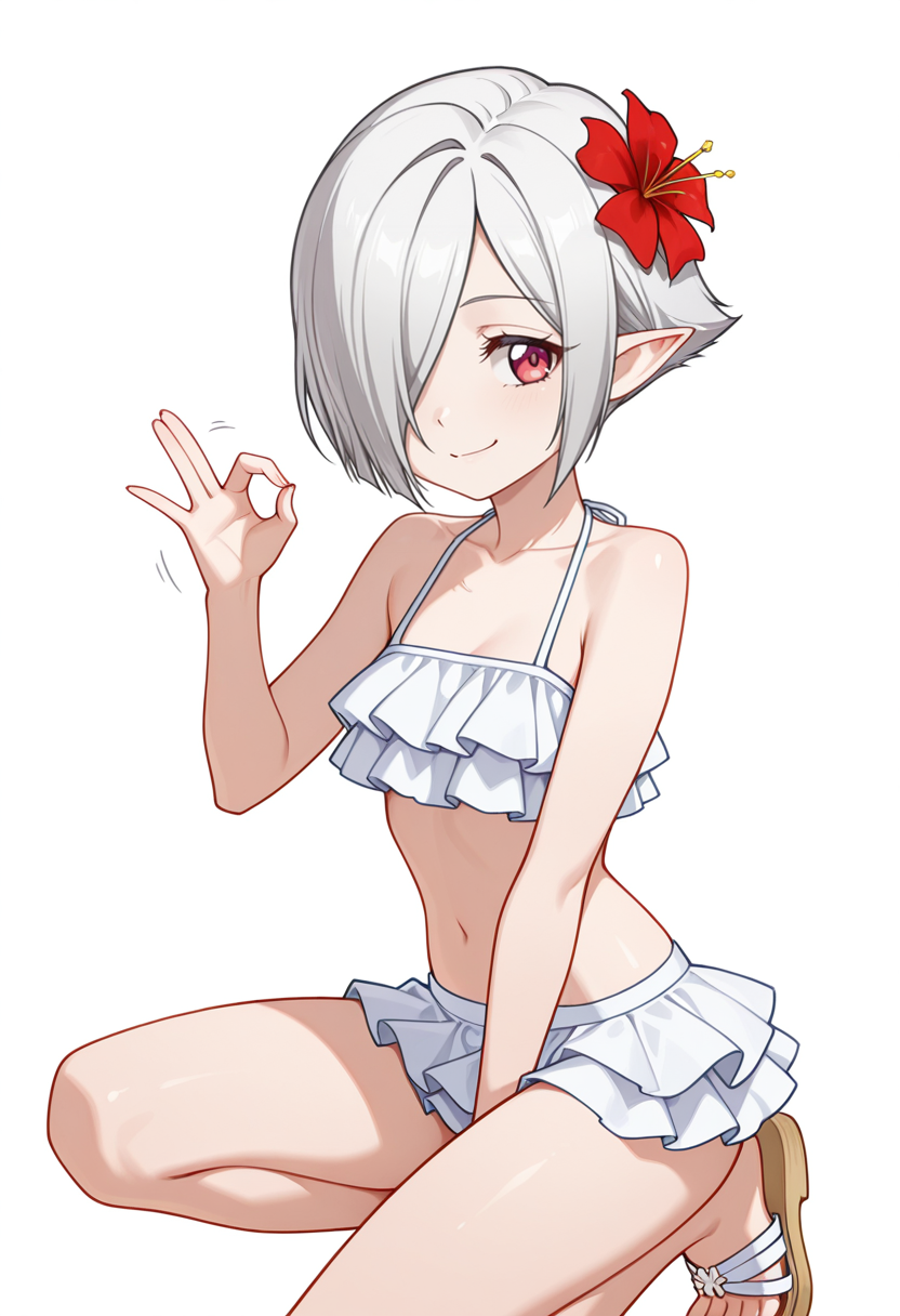 persephoneII_cnr_swim, white bikini, frilled bikini, bikini skirt, frills, hair flower, sandals,