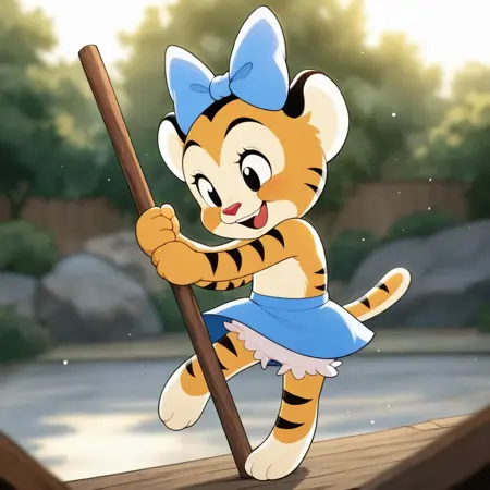 solo, girl, cub, Tillie, Tiger, 검은 눈, 머리에 파란 리본, 파란 치마, 흰 바지