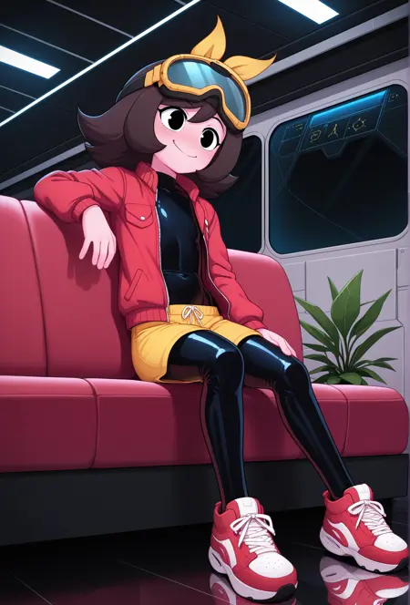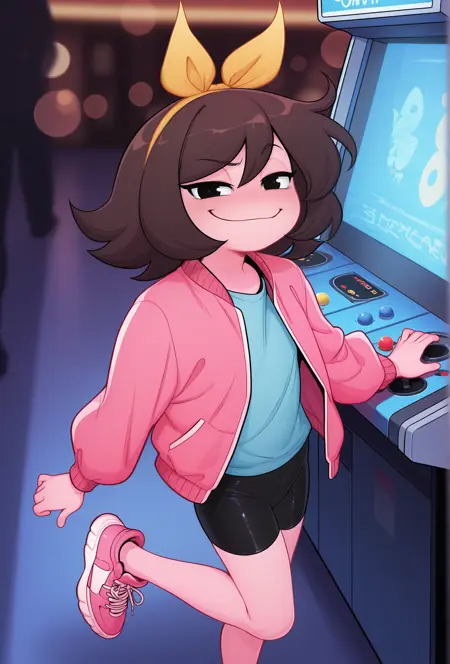 Optional: pink skin, no nose, hair bow, black eyes, red shirt, bike shorts