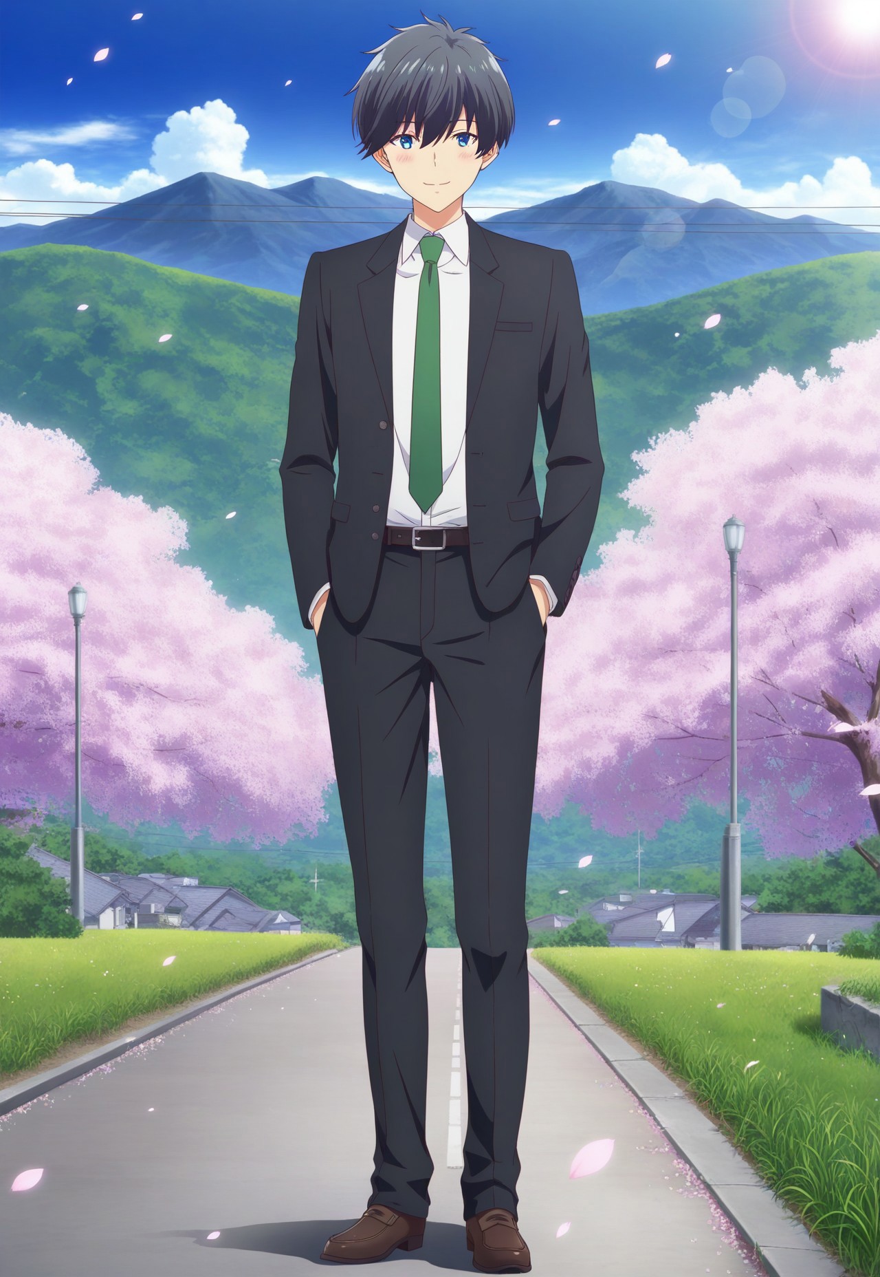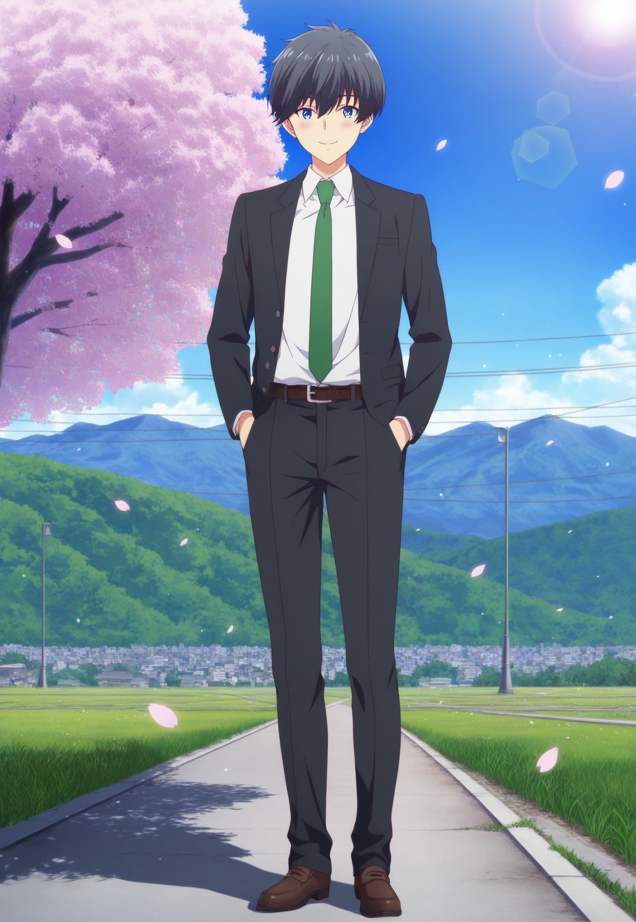 (黒ジャケット),(白シャツ),(襟付きシャツ),(緑のネクタイ),(ベルト),(黒パンツ),(茶色の靴),(ローファー),