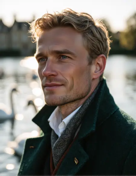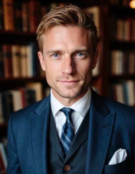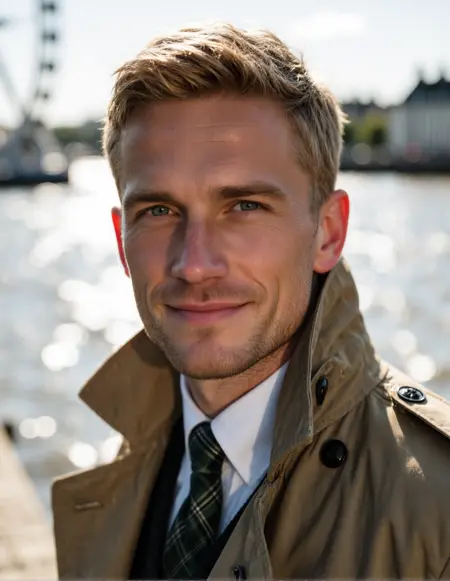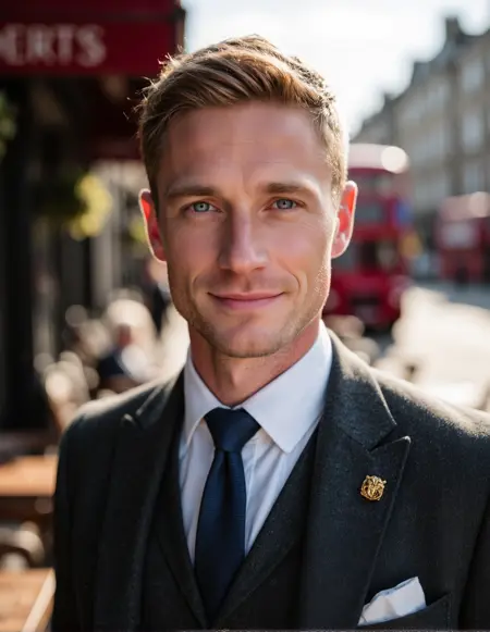 Z001aZY, 一位30岁的英国绅士肖像,梳理整齐的浅金色短发,深蓝色眼睛,白皙肤色,身着深灰色三件套西装,白色衬衫,深红色领带,金色怀表链,背景为经典伦敦街道,鹅卵石路面,远处有红色电话亭,右侧阳光勾勒出面部轮廓,建筑反射柔和光线,直视镜头,神情平静,充满优雅的英伦氛围,超现实主义细节,8K分辨率。