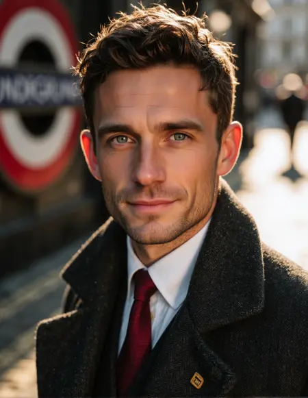 Z001aZY,A portrait of a 30-year-old British gentleman, neatly combed short light blonde hair, deep blue eyes, fair skin, wearing a dark gray three-piece suit, white shirt, deep red tie, gold pocket watch chain, background with a classic London street, cobblestone ground, a red telephone booth in the distance, sunlight from the right, outlining his facial contours, buildings reflecting soft light, direct gaze at the camera, calm expression, elegant British atmosphere, hyper-realistic details, 8K resolution.