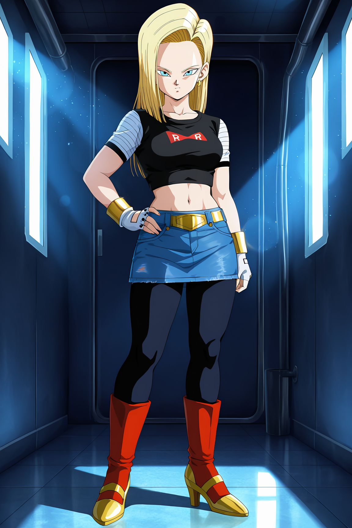 android 18, android_saga, 1girl, 短发, 蓝眼, 金发, 长袖, 珠宝, 黑色连裤袜, 金耳环, 靴子, 皮带, 蓝色裙子, 黑色衬衫, 棕色鞋履, 牛仔裙, 牛仔夹克, 蓝色夹克, 条纹袖子, 白色袖子