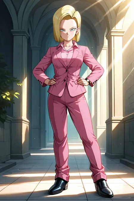 android 18, gt_outfit, 1girl, 极短发, 金发, 衬衫, 珠宝, 夹克, 耳环, 棕色皮带, 方形扣, 裤子, 项链, 高跟鞋, 正式, 红色鞋履, 珠子项链, 珍珠项链, 紫色裤子, 紫色夹克, 高腰裤, 粉色衬衫, 西装, 白色翻领