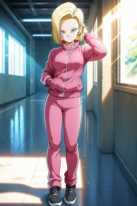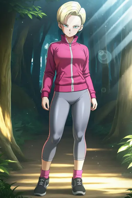 android 18, dbs_tracksuit, 1girl, 短发, 蓝眼, 金发, 珠宝, 银色耳环, 拉链, 运动夹克, 运动服套装, 运动裤, 粉色夹克, 粉色裤子, 运动鞋, 黑色鞋履