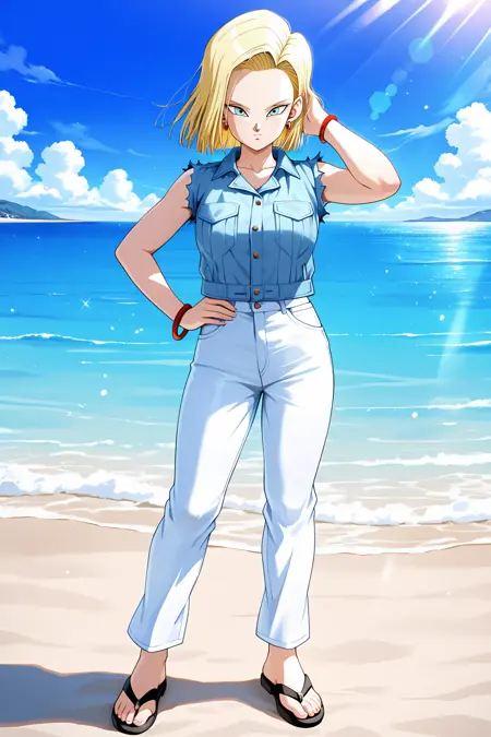 android 18, buu_saga_casual, 1girl, 短发, 蓝眼, 金发, 珠宝, 无袖, 牛仔裤, 胸袋, 红色手链, 浅蓝色夹克, 红色耳环, 黑色凉鞋, 白色裤子, 破损夹克