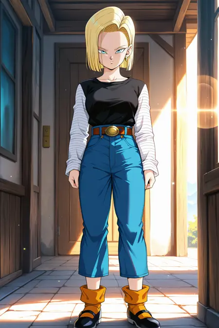 android 18, buu_saga, 1girl, 短发, 蓝眼, 金发, 皮带, 牛仔裤, 蓝色裤子, 黑色衬衫, 条纹袖子, 白色袖子, 高腰裤, Mary Jane鞋, 松垮袜子, 橙色袜子, 黑色鞋履, 红色耳环