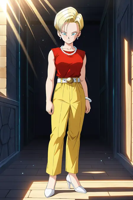 android 18, gt_casual_outfit, 1girl, 极短发, 蓝眼, 金发, 珠宝, 银色耳环, 白色皮带, 棘轮皮带, 高跟鞋, 白色手链, 白色鞋履, 红色衬衫, 衬衫塞入裤内, 珍珠项链, 正式裤子, 黄色裤子, 无袖衬衫