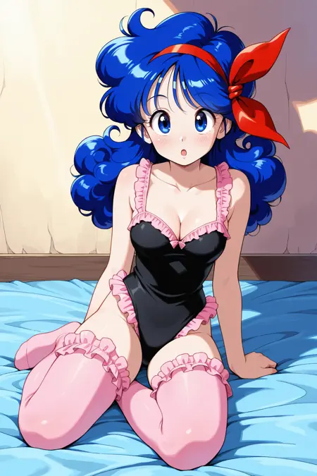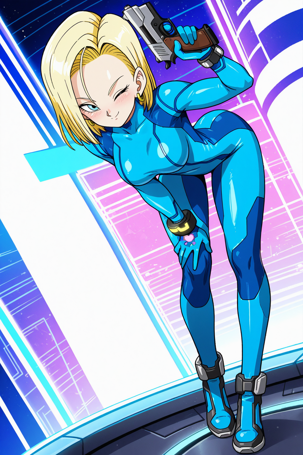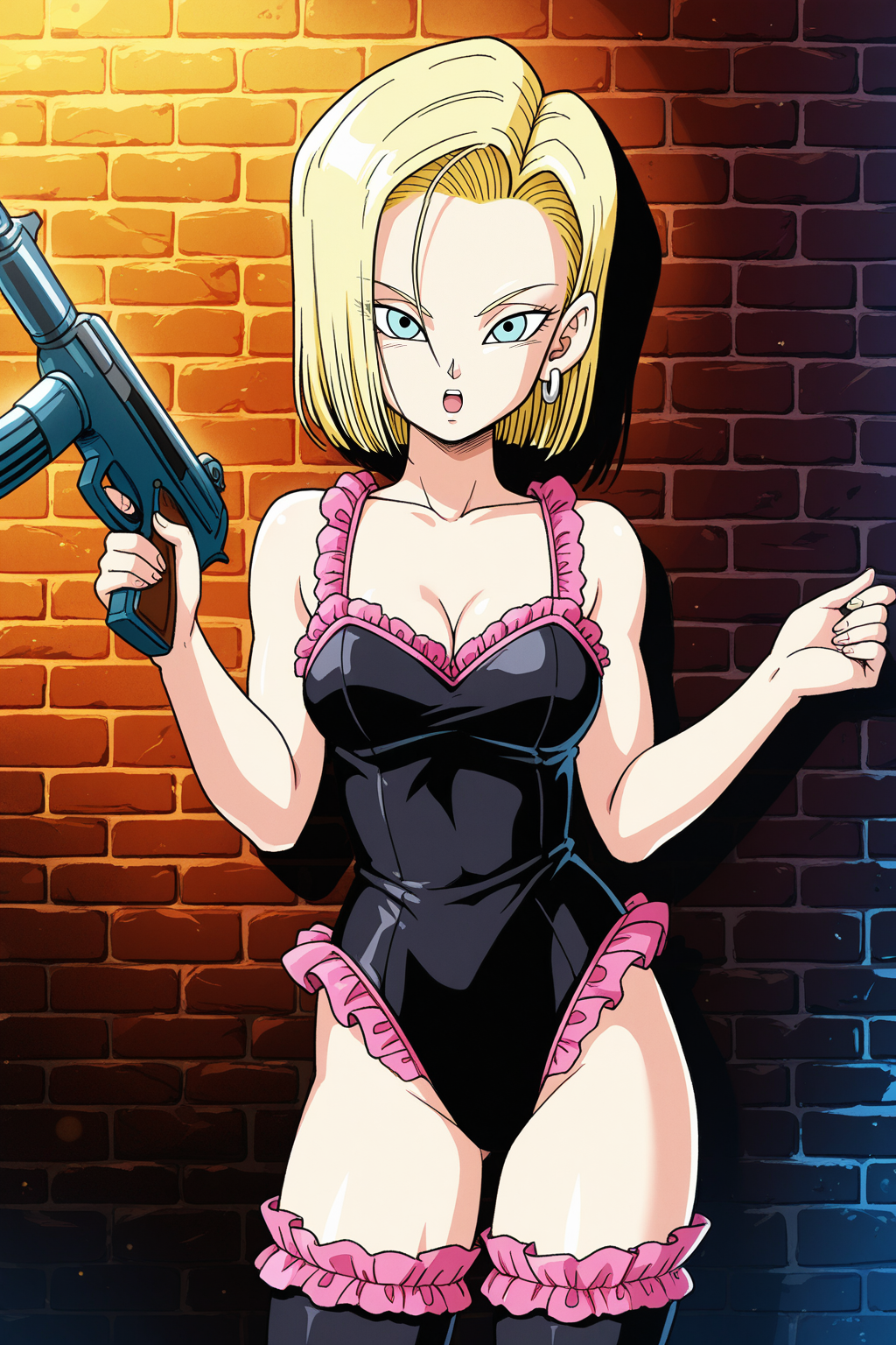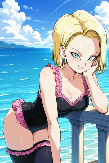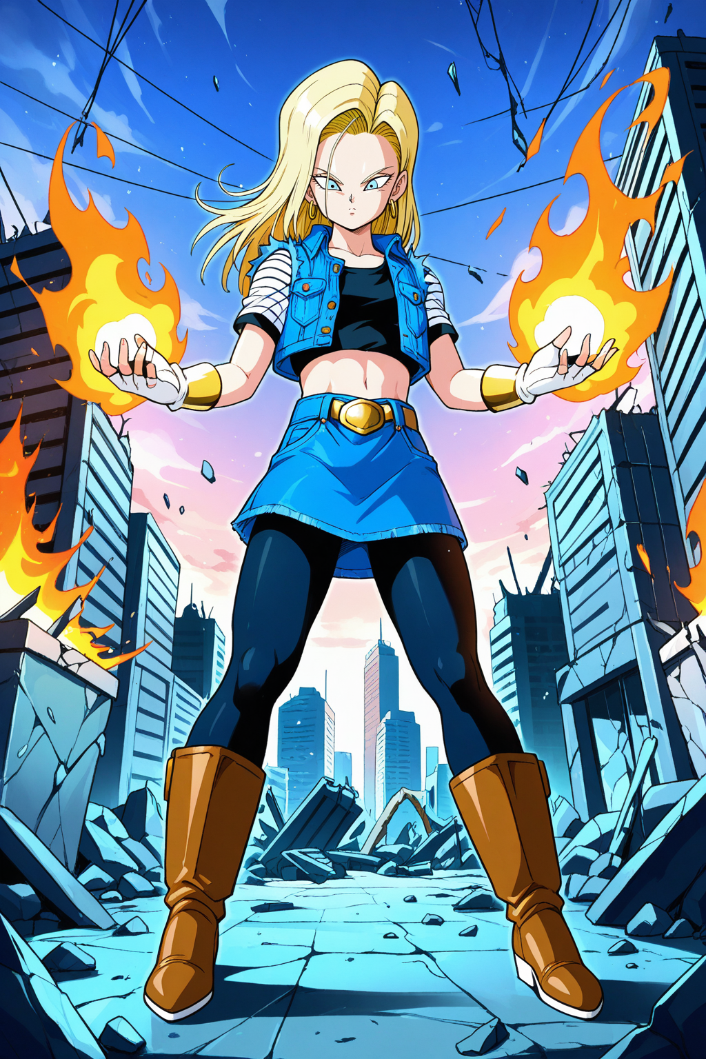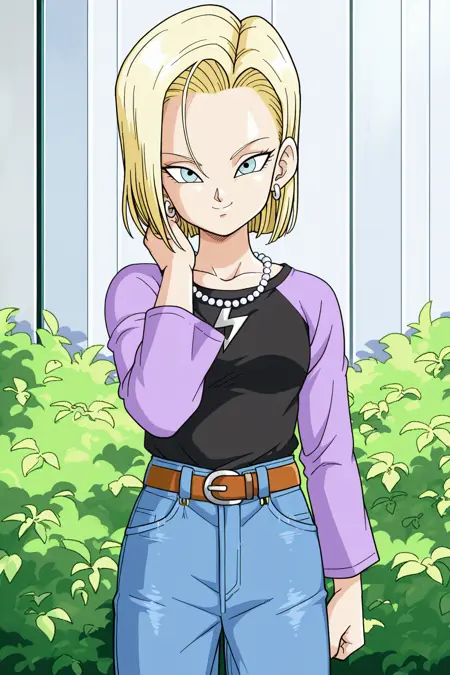 android 18, buu_saga, 1girl, short hair, blue eyes, blonde hair, belt, denim pants, blue pants, black shirt, striped sleeves, white sleeves, high-waist pants, mary janes, loose socks, orange socks, black footwear, red earrings