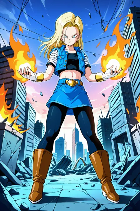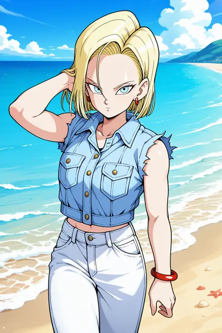 android 18, buu_saga_casual, 1girl, short hair, blue eyes, blonde hair, jewelry, sleeveless, denim pants, breast pocket, red bracelet, light blue jacket, red earrings, black sandals, white pants, torn jacket
