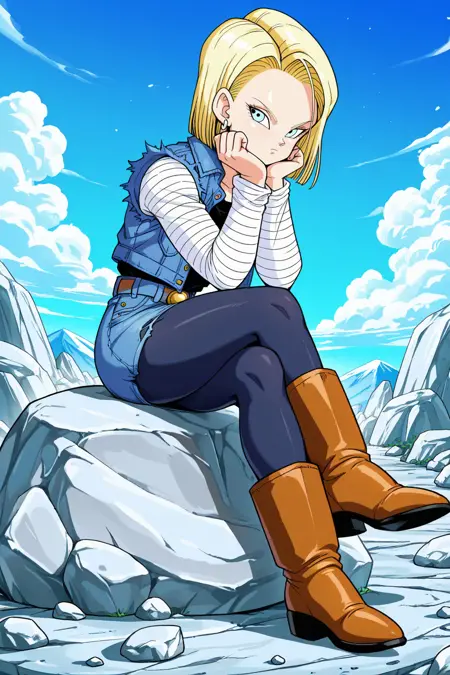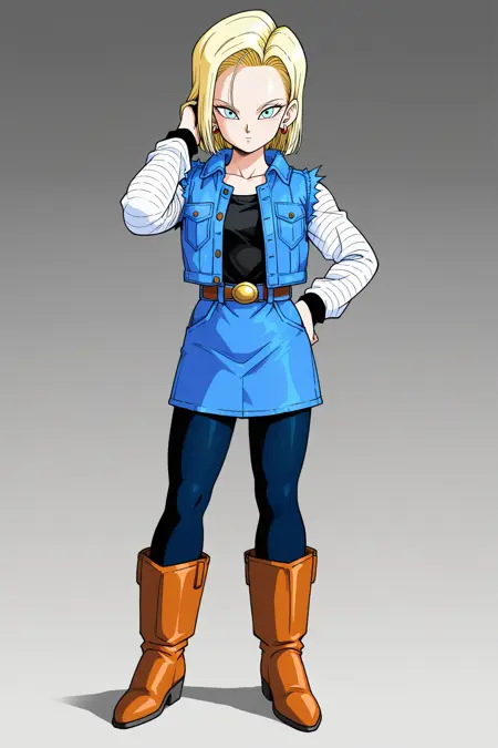android 18, android_saga, 1girl, short hair, blue eyes, blonde hair, long sleeves, jewelry, black pantyhose, gold earrings, boots, belt, blue skirt, black shirt, brown footwear, denim skirt, denim jacket, blue jacket, striped sleeves, white sleeves