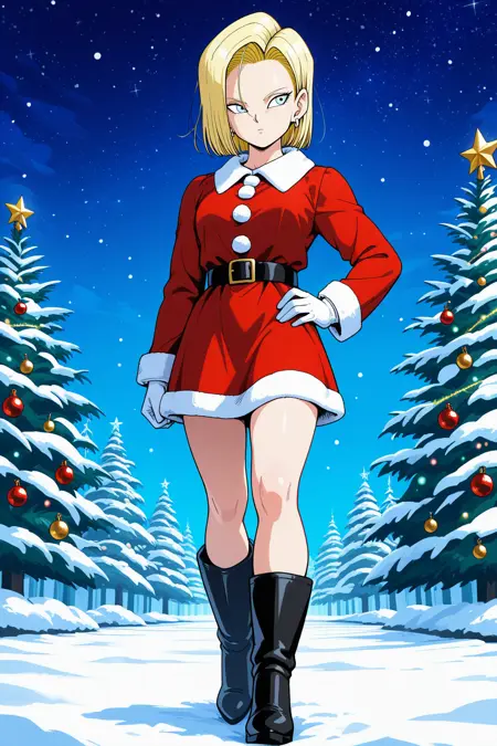 android 18, gt_casual_outfit, 1girl, very short hair, blue eyes, blonde hair, red shirt, jewelry, silver earrings, blue pants, denim pants, red footwear, jeans, bead necklace, pearl necklace, formal shoes, long sleeves, turtleneck