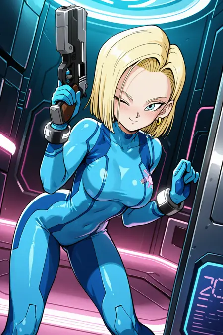 android 18, dbs_tracksuit, 1girl, short hair, blue eyes, blonde hair, jewelry, silver earrings, zipper, track jacket, track suit, track pants, pink jacket, pink pants, sneakers, black footwear