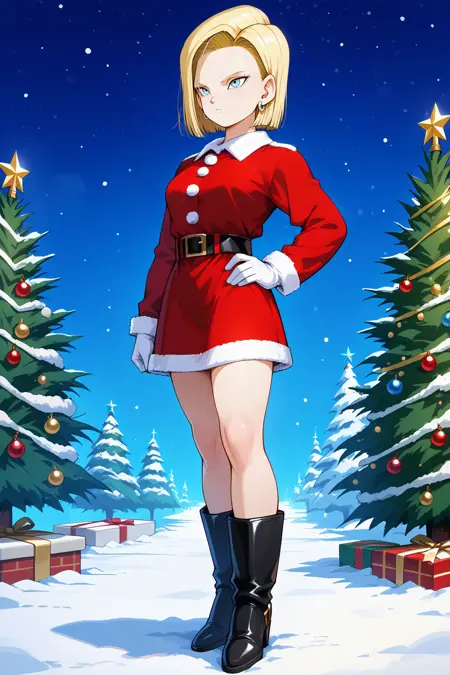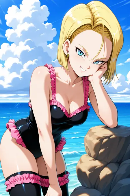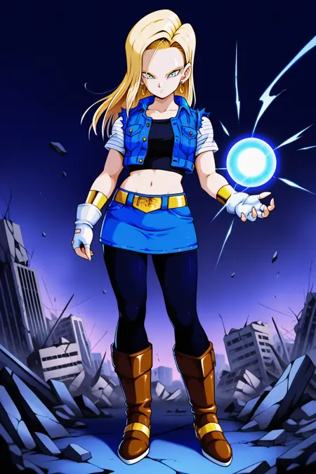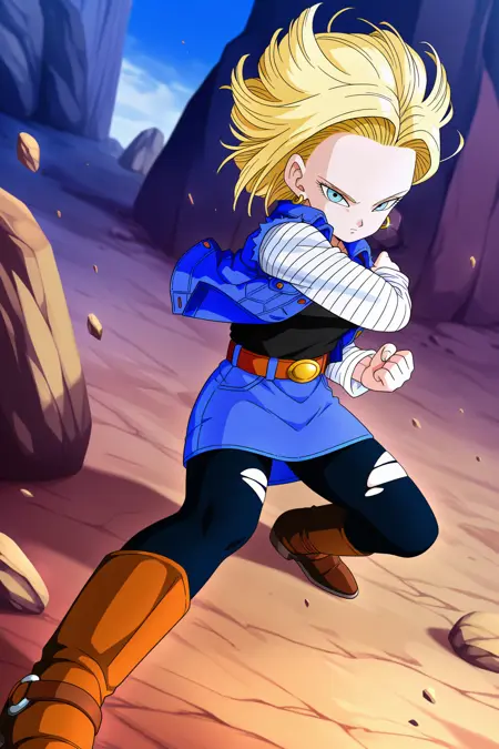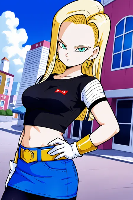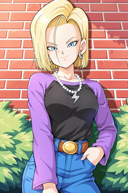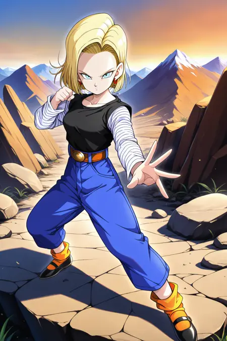 android 18, buu_saga, 1girl, short hair, blue eyes, blonde hair, belt, denim pants, blue pants, black shirt, striped sleeves, white sleeves, high-waist pants, mary janes, loose socks, orange socks, black footwear, red earrings