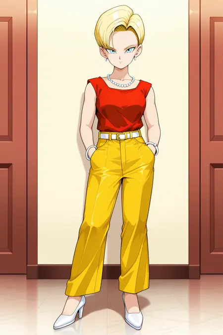android 18, gt_casual_outfit, 1girl, very short hair, blue eyes, blonde hair, jewelry, silver earrings, white belt, ratchet belt, high heels, white bracelet, white footwear, red shirt, shirt tucked in, pearl necklace, formal pants, yellow pants, sleeveless shirt