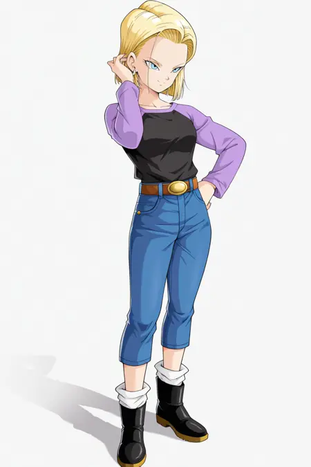 android 18, dbs_casual, 1girl, short hair, blue eyes, blonde hair, long sleeves, jewelry, silver earrings, denim pants, jeans, black shirt, purple sleeves, black footwear, raglan sleeves, boots, loose socks, white socks, blue pants, capri pants