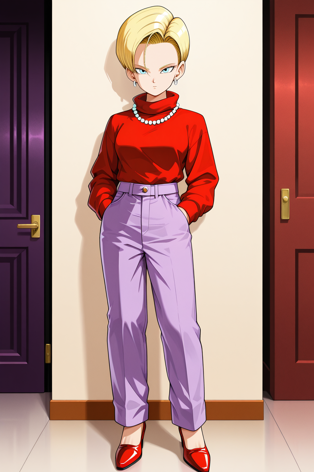 android 18, gt_casual_outfit, 1girl, very short hair, blue eyes, blonde hair, red shirt, jewelry, silver earrings, blue pants, denim pants, red footwear, jeans, bead necklace, pearl necklace, formal shoes, long sleeves, turtleneck