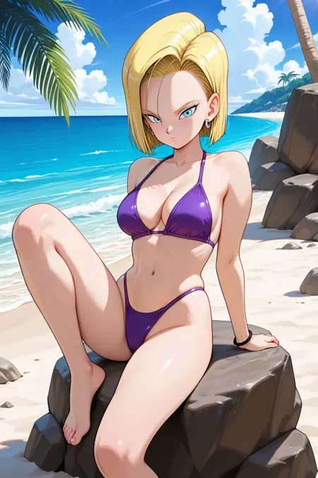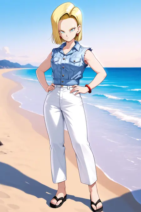 android 18, buu_saga_casual, 1girl, short hair, blue eyes, blonde hair, jewelry, sleeveless, denim pants, breast pocket, red bracelet, light blue jacket, red earrings, black sandals, white pants, torn jacket