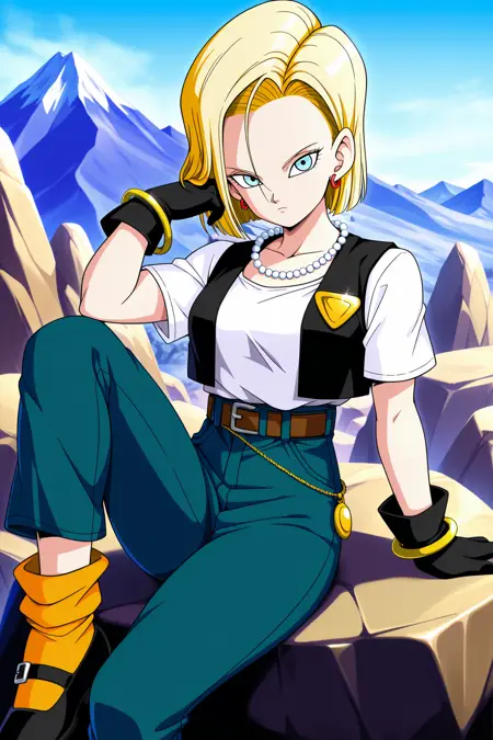 android 18, cell_saga, 1girl, short hair, blue eyes, blonde hair, jewelry, short sleeves, gold earrings, black gloves, belt, square buckle, necklace, denim pants, high-waist pants, mary janes, loose socks, badge, black vest, gold bracelet, orange socks, gold chain, shirt tucked in, white shirt, black footwear