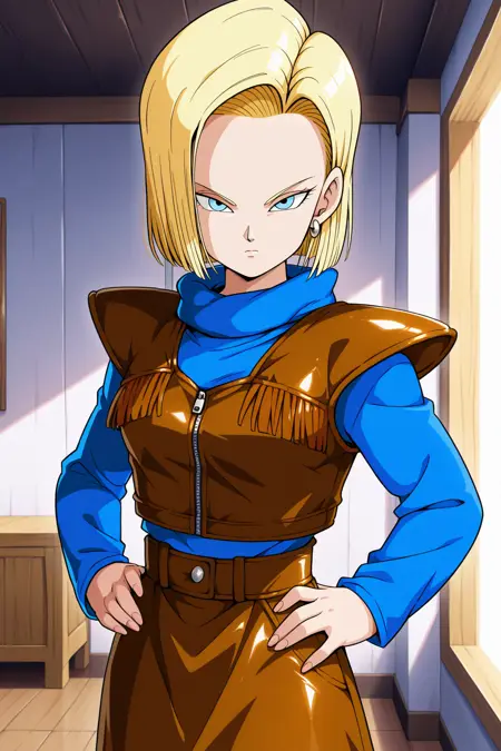 android 18, cowgirl_outfit, 1girl, short hair, blue eyes, blonde hair, long sleeves, jewelry, earrings, brown jacket, turtleneck, brown skirt, blue shirt, button, zipper, shoulder pads, fringe trim, black pantyhose, cowboy boots, brown footwear