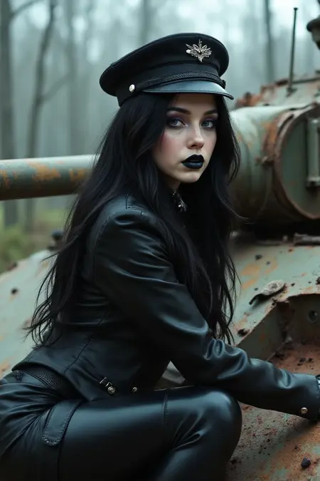 布兰娜是哥特式优雅的肉身化身——强烈、神秘,毫不掩饰地做自己。乌黑的长发如柔波般垂落在瓷白的肌肤周围,浓烈的黑色唇彩与烟熏眼妆赋予她一种既幽灵般迷人又充满吸引力的气质。在那张她跪于湖水中的图像里,身着极简黑衣,她宛如现代的女妖——静谧、锐利,蕴含着无声的反抗。她的肢体语言无需喧哗便已诉说千言:优雅的姿态、直视的目光、克制的火焰。她佩戴一条简单的黑色项圈,如护身符般,锚定着她的风格与象征意义。