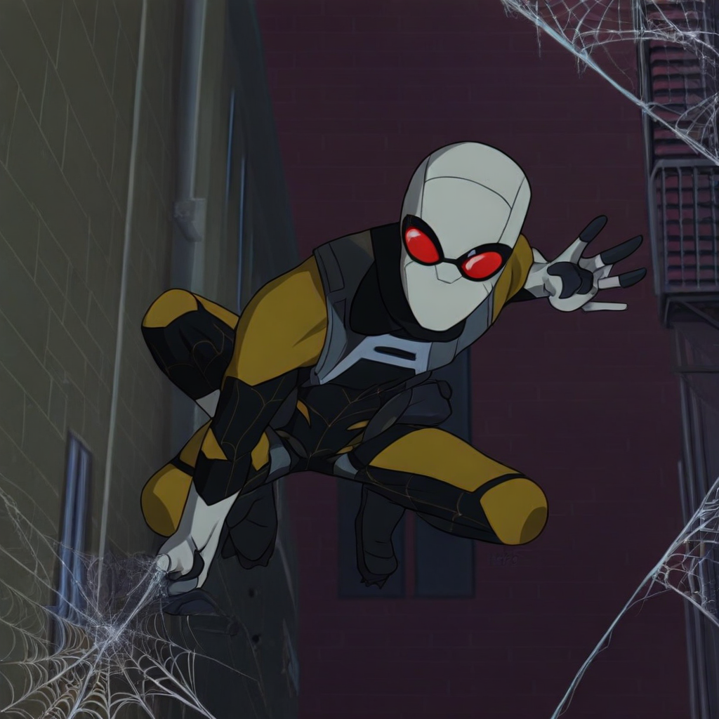Agent Spider, white mask, red lenses, bodysuit, black and yellow bodysuit, spiderweb pattern, white gloves, harness, pouches