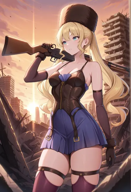 long hair, blonde hair, twintails, short dress, corset, elbow gloves, thighhighs, thigh strap, fur hat,