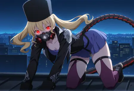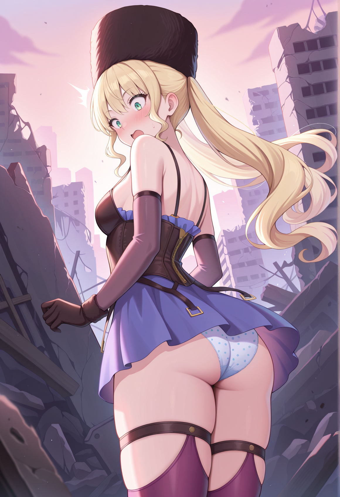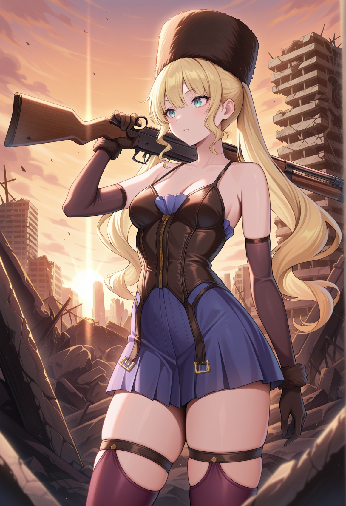 显著标签: 长发、金发、双马尾、短裙、紧身胸衣、肘部手套、过膝袜、大腿绑带、毛皮帽,