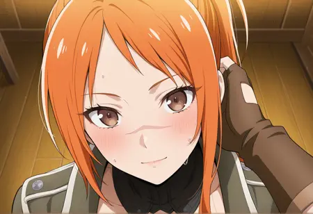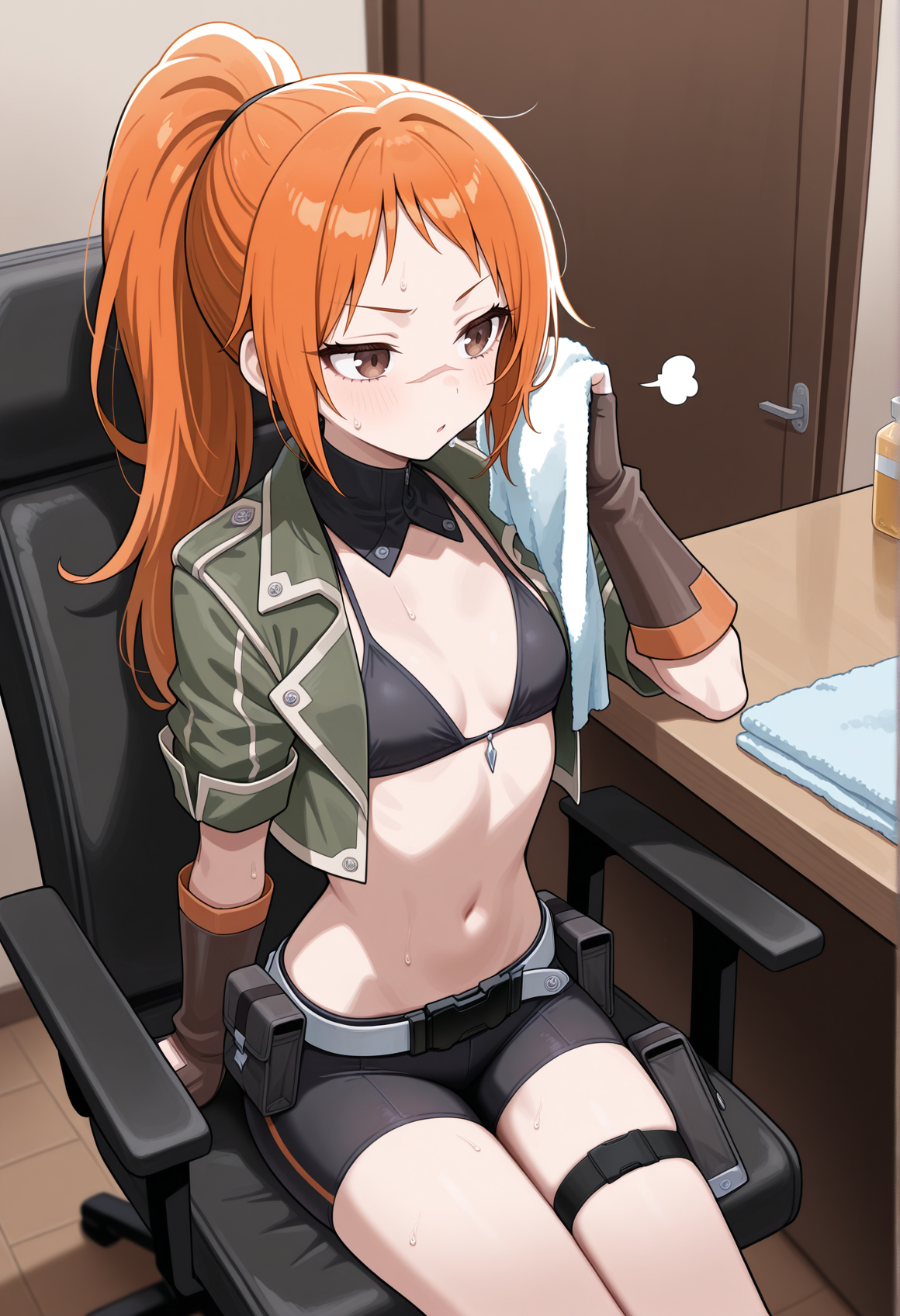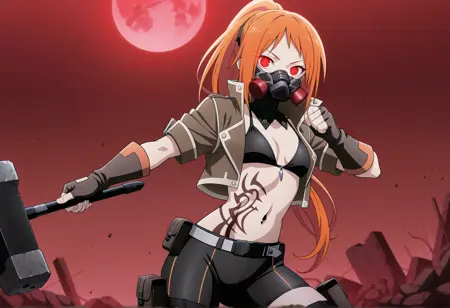 주요 태그: 오렌지색 머리, 갈색 눈, 포니테일, 긴 머리, 분리형 칼라, 비키니, 커팅 재킷, 복부 문신, 손가락 없는 장갑, 자전거 바지, 벨트, 패치, 허벅지 홀스터