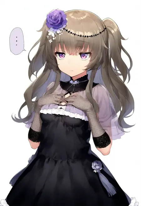 meimei himari, brown hair, two side up, purple eyes, hair ornament, hair flower, rose,
