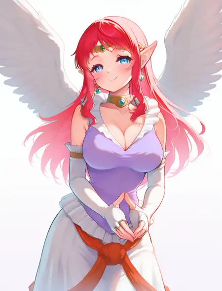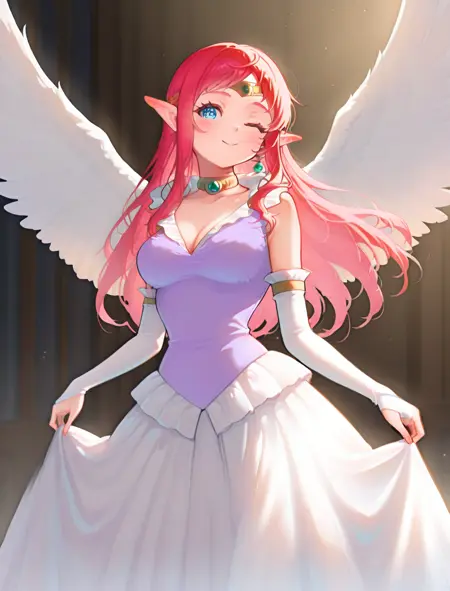 choker, wings, single earring, crown, purple shirt, sleeveless shirt, white gloves, white skirt