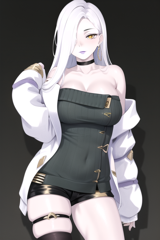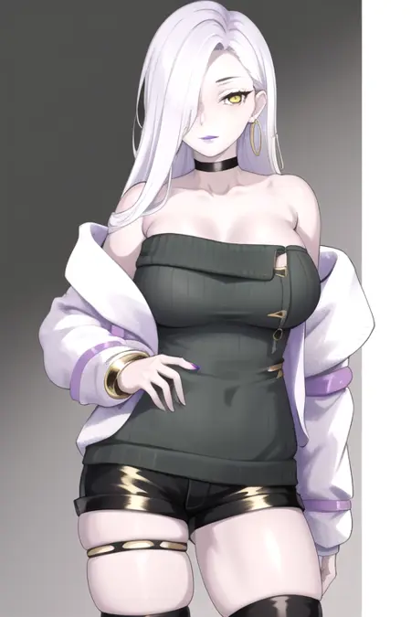 MrsSnake, 1girl, hair over one eye, sweater dress, yellow eyes, long hair, large breasts, black shorts, black choker, white hair, sleeves past fingers, jewelry, white jacket, grey sweater, single earring, pale skin, thighhighs, purple lips, thigh strap, long sleeves, single bare shoulder, short shorts, ribbed sweater, hoop earrings