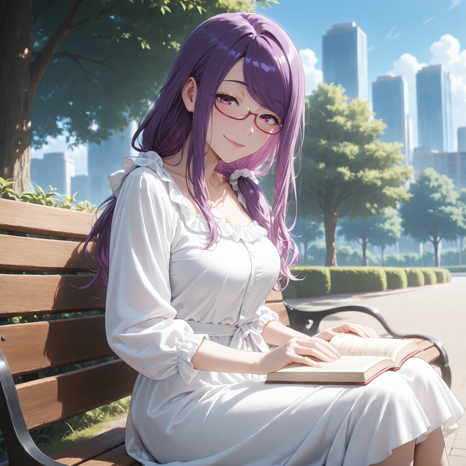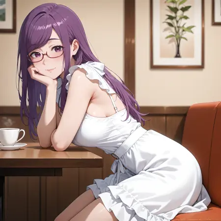 默认服装:rize_kamishiro-ill,1girl,solo,紫色头发,长发,直发,紫色眼睛,刘海飘逸,白色连衣裙,荷叶边,中等大小胸部