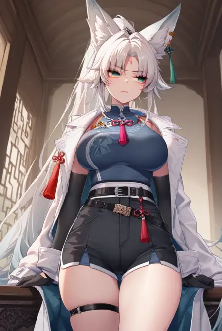 1girl, Feixiao, animal ears, long hair, ponytail, multicolored hair, white hair, red eyeliner, ringed eyes, forehead mark, ear piercing, blue shirt, high collar, tassel, coat, gloves, fingerless gloves, grand belt, waist cape, black shorts, thigh strap, knee boots