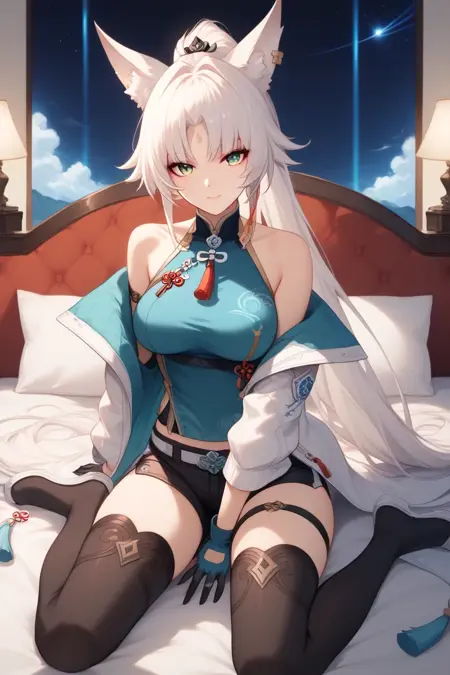 1girl, Feixiao, animal ears, long hair, ponytail, multicolored hair, white hair, red eyeliner, ringed eyes, forehead mark, ear piercing, blue shirt, high collar, tassel, coat, gloves, fingerless gloves, grand belt, waist cape, black shorts, thigh strap, knee boots
