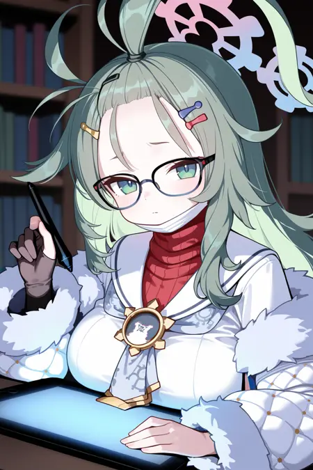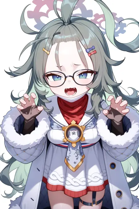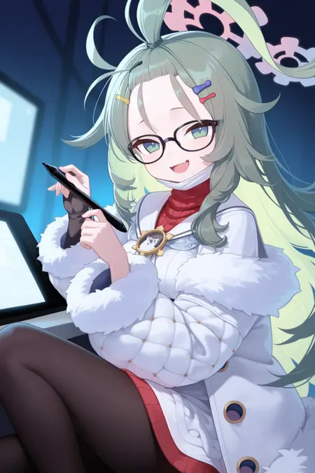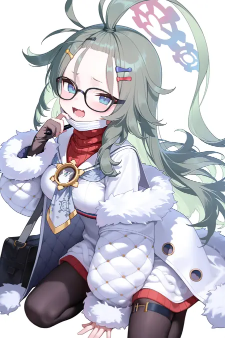 meru \(blue archive\),1girl,glasses,solo, halo, ahoge, hair ornament, pantyhose, glasses, long hair, hairclip, black pantyhose, sweater, green eyes, green hair, grey hair, fur trim, sailor collar,