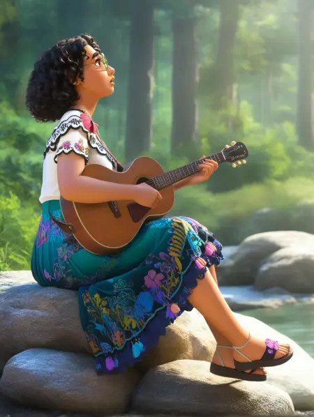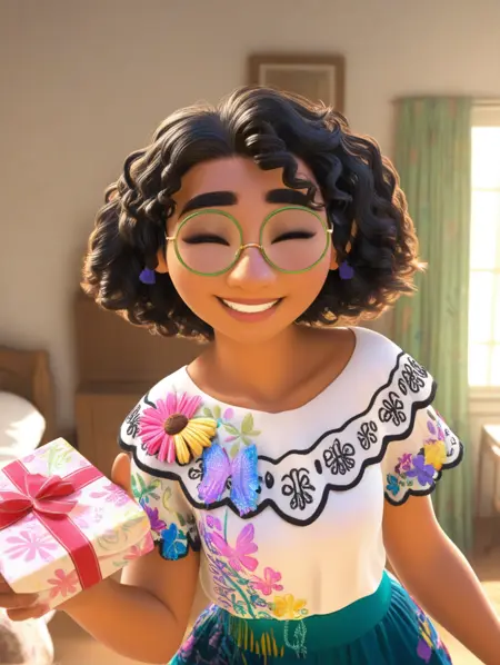 Mirabel_Madrigal, short hair, curly hair, black hair, green glasses, brown eyes, brown skin, lips, 1girl, original style