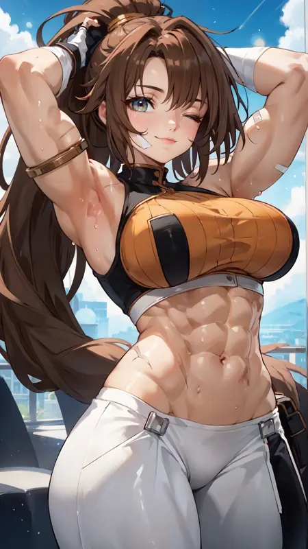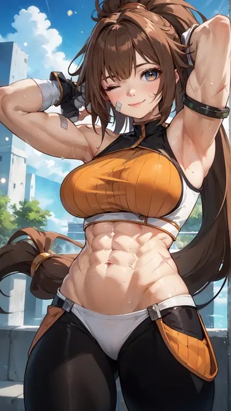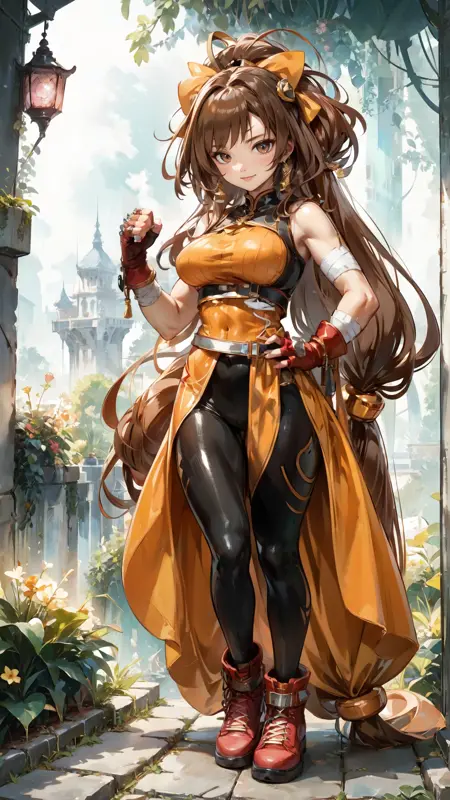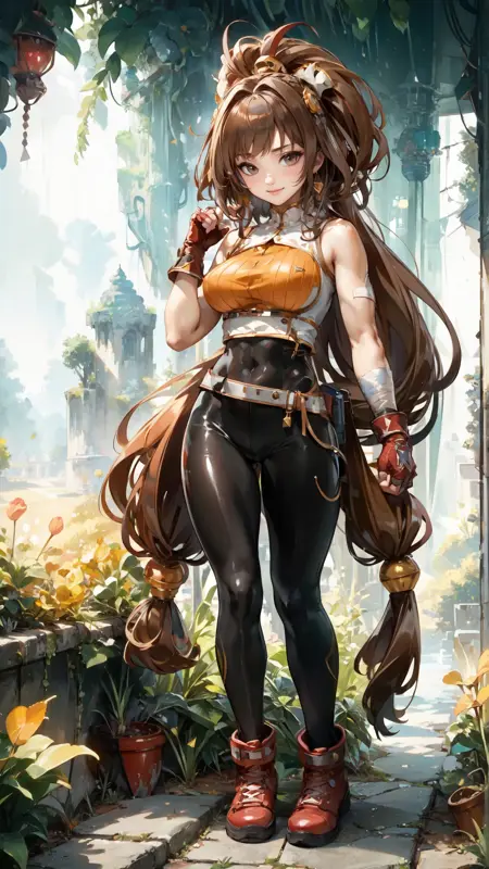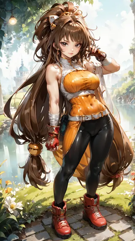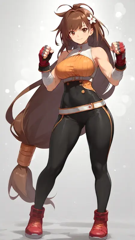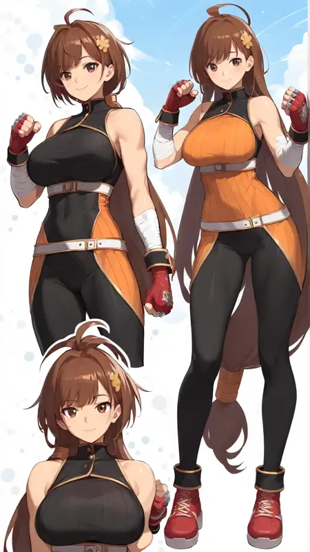 예시 프롬프트: "female_striker_DNF, 애니메이션 소녀, 1girl, 싱글, 긴 머리, 가슴, 관찰자 바라보기, 미소, 앞머리, 큰 가슴, 단순한 배경, 갈색 머리, 머리 장식, 장갑, 흰색 배경, 어깨 노출, 갈색 눈, 매우 긴 머리, 닫힌 입, 서 있는 자세, 전체 신체, 신발, 어깨 없는, 반짝이는, 벨트, 손가락 없는 장갑, 반짝이는 머리, 붕대, 빨간 신발, 스니커즈, 쥐어짠 손, 몸에 딱 붙는, 빨간 장갑, 낮게 묶인 긴 머리, 반짝이는 옷"