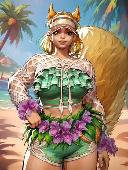 Head/body keywords: green eyes, squirrel ears, blonde hair, medium hair, orange large tail, large breasts, ears through headwear, hoop earrings