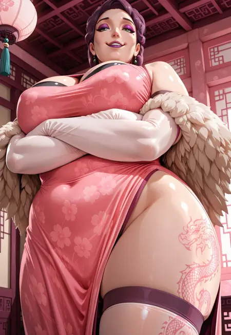 pink china dress, black bracups, white elbow gloves, see-through thighhighs, feather boa,