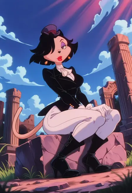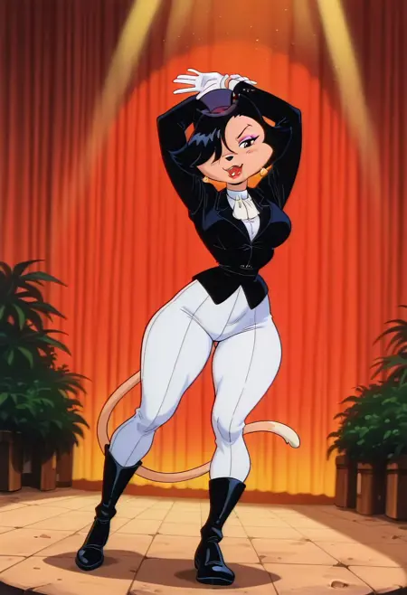 KatyaLeggsgowannalotMS, 1girl, solo, 페르리 여성, 앤트로, 단발, 검은 머리, 한쪽 눈에 머리카락, 검은 눈, 아이섀도우, 검은 코, 입술, 빨간 립스틱, 귀걸이, 큰 가슴, 두꺼운 허벅지, 꼬리, 블랙 모자, 검은 재킷, 흰색 셔츠, 애스콧, 흰색 바지, 검은 부츠, 흰장갑,