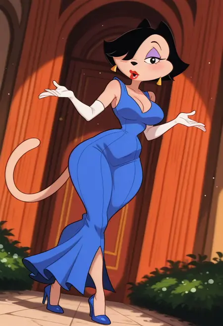 KatyaLeggsgowannalotMS, 1girl, solo, 페르리 여성, 앤트로, 단발, 검은 머리, 한쪽 눈에 머리카락, 검은 눈, 아이섀도우, 검은 코, 입술, 빨간 립스틱, 귀걸이, 큰 가슴, 두꺼운 허벅지, 꼬리, 파란 드레스, 컷아웃 드레스, 소매 없음, 파란 신발, 흰색 팔꿈치 장갑,