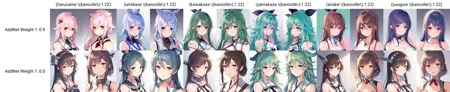 在 Counterfeit-V2.5 上,权重 0.4–0.8 表现良好。若与其他 LoRA 等组件合并使用,可能需要使用更低权重。