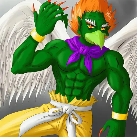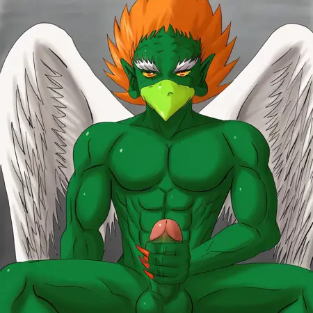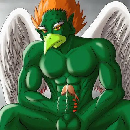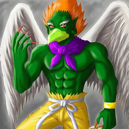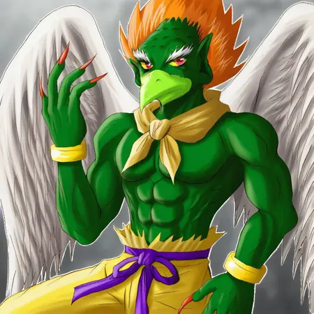 ◇Karura(《新桃太郎传说》),鬼,拟人化,翅膀,羽毛翅膀,灰色翅膀,喙,绿色喙,上身赤裸,皮肤,绿色皮肤,肌肉发达的体型,头发,刺猬状头发,橙色头发,红色眼睛,肌肉发达的手臂,围巾,紫色围巾,系带,裤子,肉色裤子,绷带,紫色鞋子,手镯,紫色手镯,爪子