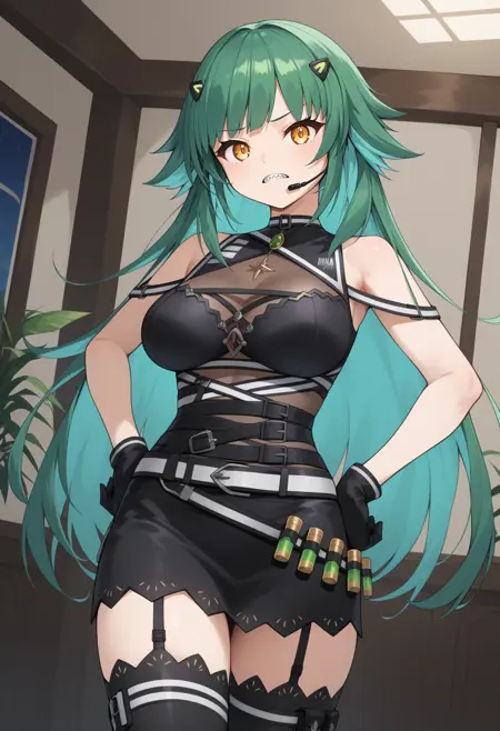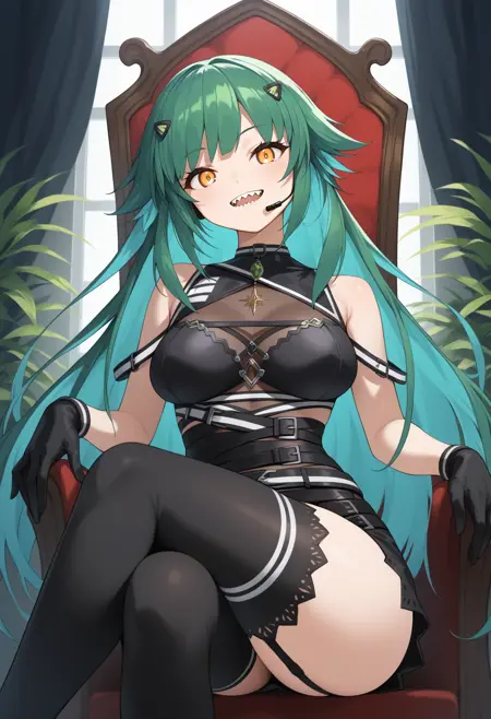 outfit2bbhisui, long hair, green hair, hair ornament, headset, yellow eyes, sharp teeth, medium breasts, see-through, short dress, black dress, sleeveless, black gloves, belt, garter straps, black thighhighs