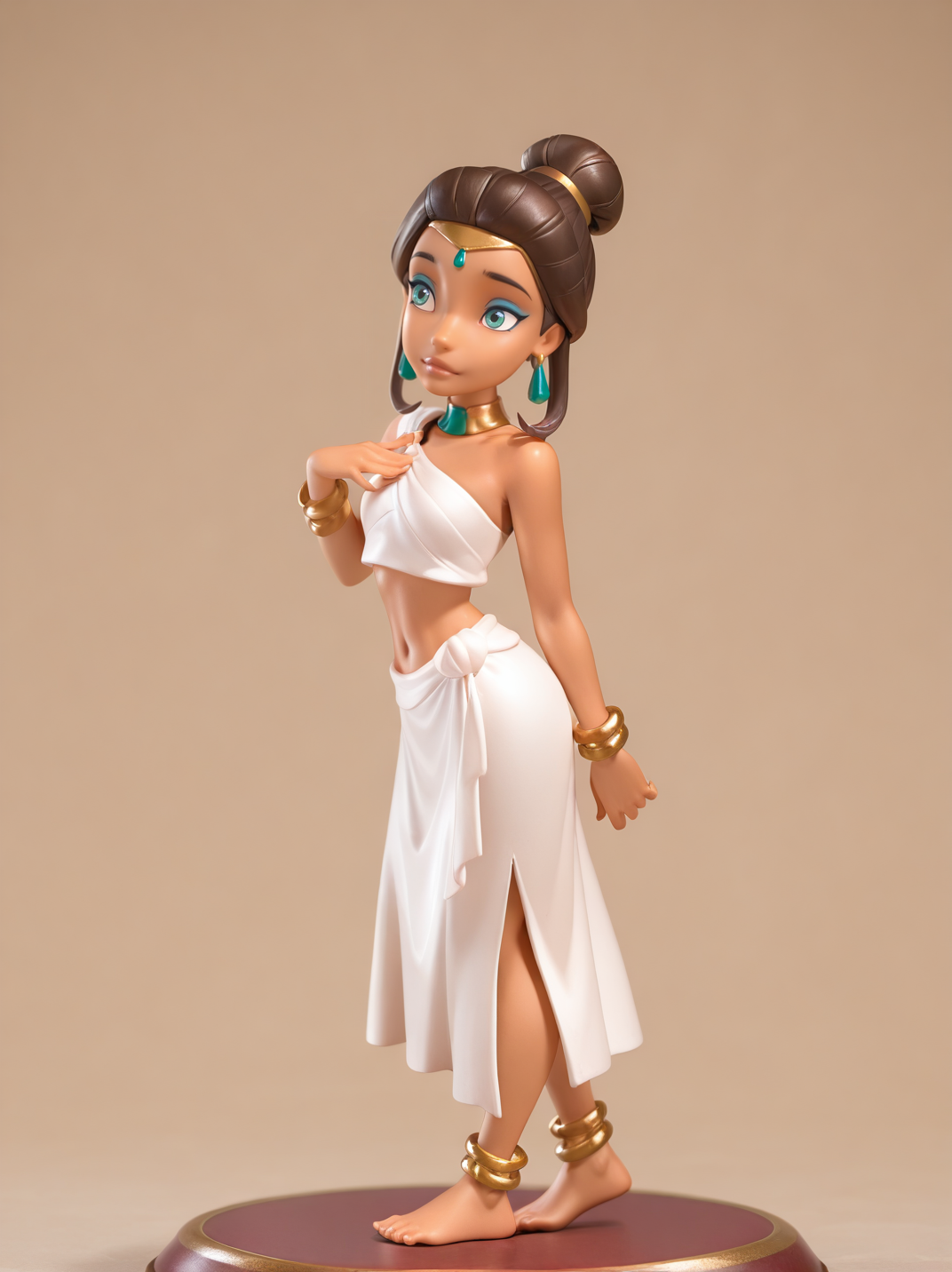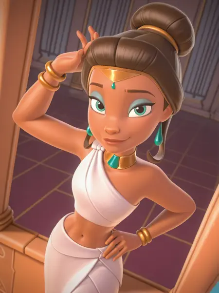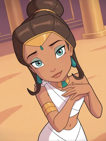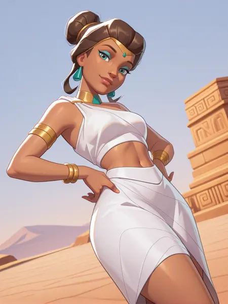 主なキーワード:"緑の髪、髪の結び目、濃い肌色、茶色の髪、ジュエリー、イヤリング、チョーカー、化粧、白いシャツ、片方の肩を露出、へそ、腹肌、白いスカート、ブレスレット、足首輪、エジプト風の服"