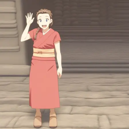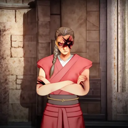 1girl,solo,brown hair,single braid,long hair,blue eyes,sarashi,red robe,short sleeves,sash,pants, brown footwear