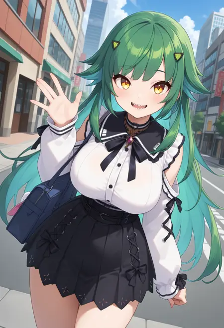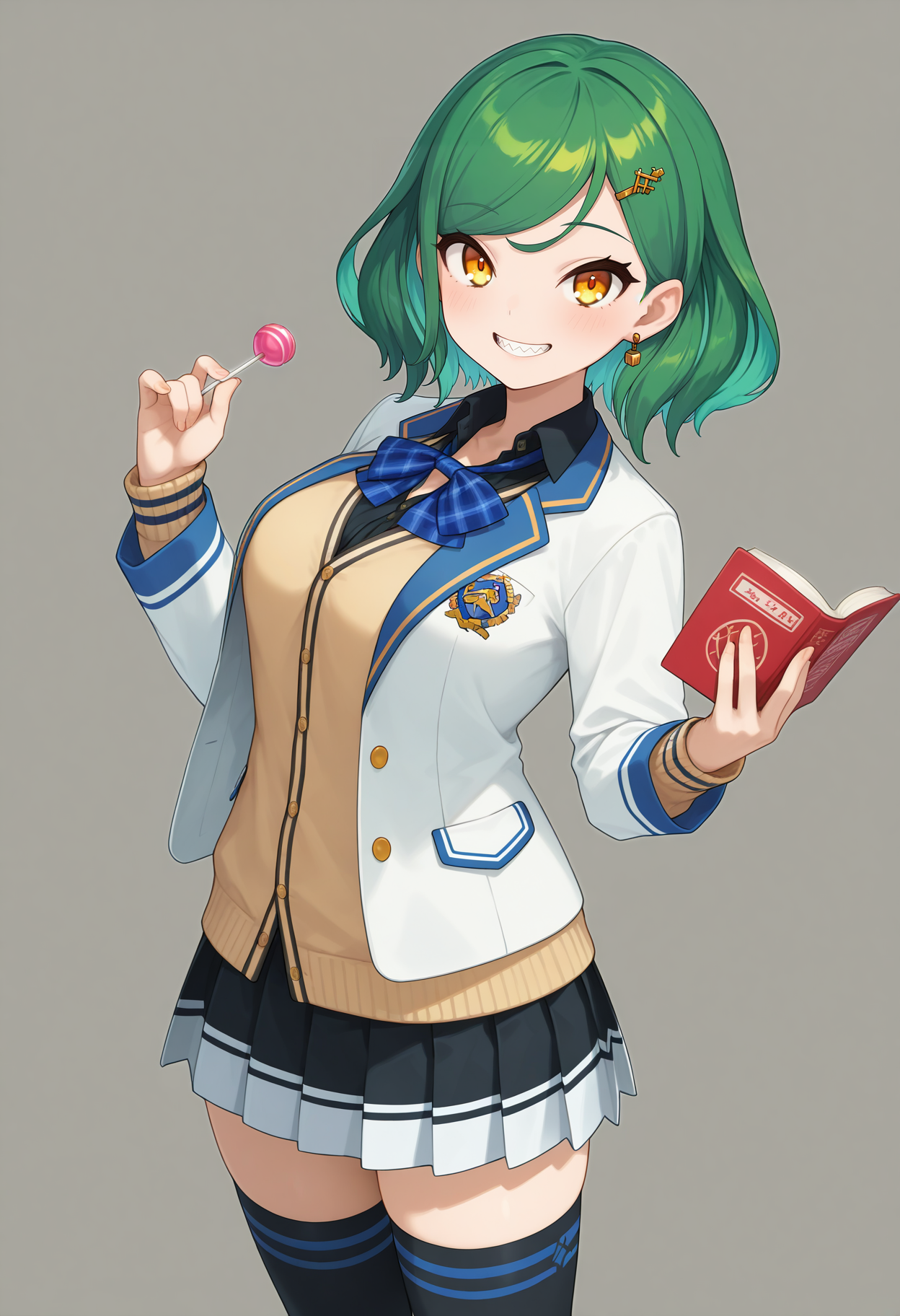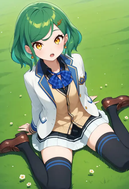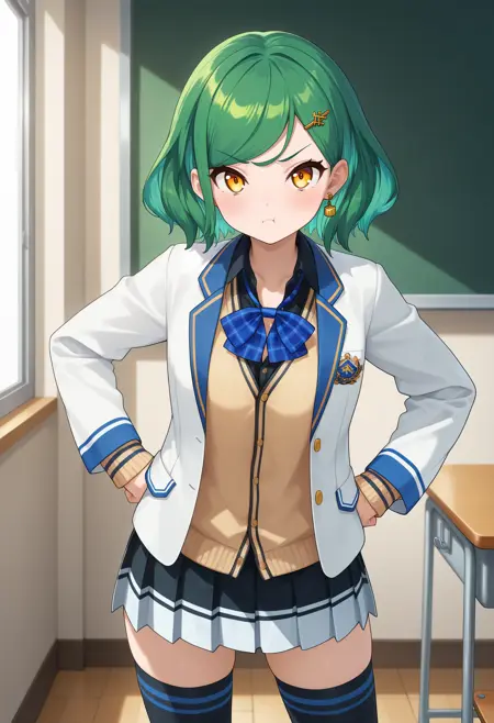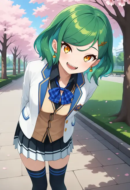 outfit1aahisui, short hair, green hair, hairclip, earrings, yellow eyes, sharp teeth, school uniform, blue bowtie, collared shirt, black shirt, brown cardigan, white jacket, long sleeves, pleated skirt, black skirt, black thighhighs