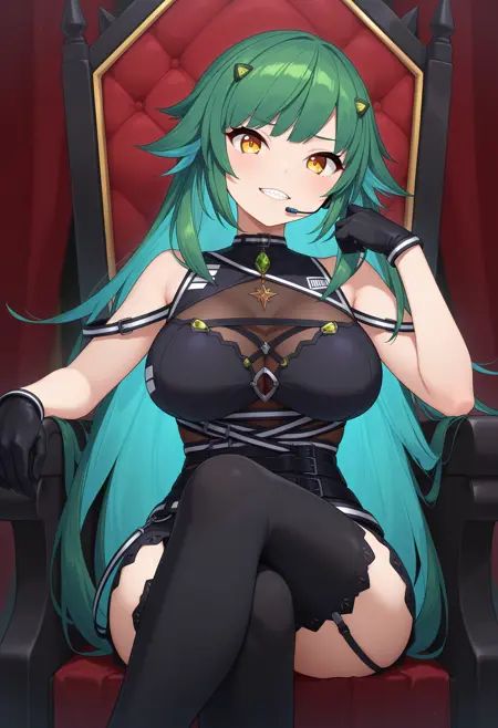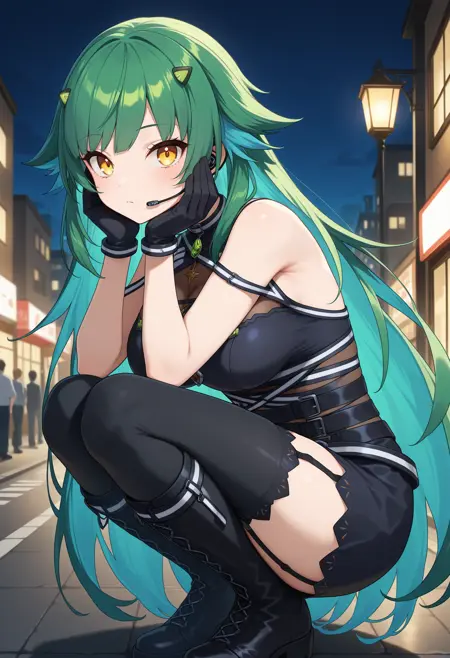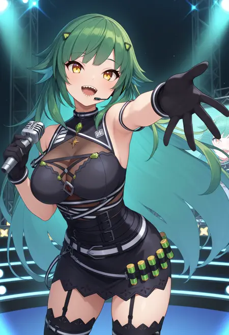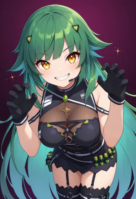 outfit2bbhisui, long hair, green hair, hair ornament, headset, yellow eyes, sharp teeth, see-through, short dress, black dress, sleeveless, black gloves, belt, garter straps, black thighhighs